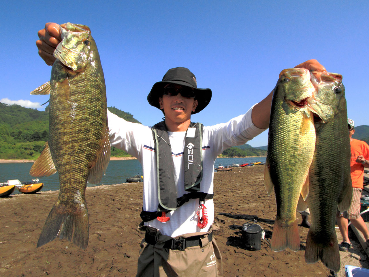 今回も例に違わずスタート直後に周囲の動きを確認してから、人の少ない場所を目指す通称「裏道釣り師」ぶりを発揮。人のいない八木干拓にあるテトラを釣り、3本2385gを揃えた。ルアーは、テトラと網の間を4’パワーホグのテキサスで、水没したテトラ周辺をスピナーベイトで2本キャッチ。当日はテトラの沖を釣るとキャットフィッシュが多く、インサイドを釣るとバスの反応があった様子。