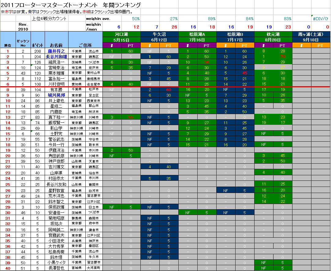 「強い」という言葉以外見つからない長谷川氏の活躍ですが、その時の状況を的確に把握して自分の釣りに合ったコンディションの良い魚をキャッチする知識(経験)と技術が優れているのは当然のことながら、その華々しい釣果の陰には誰よりも精力的にプラクティスを行う努力があることを忘れてはならない。来年度も彼がマスター最有力候補であることは間違いないだろう。本当におめでとうございました。