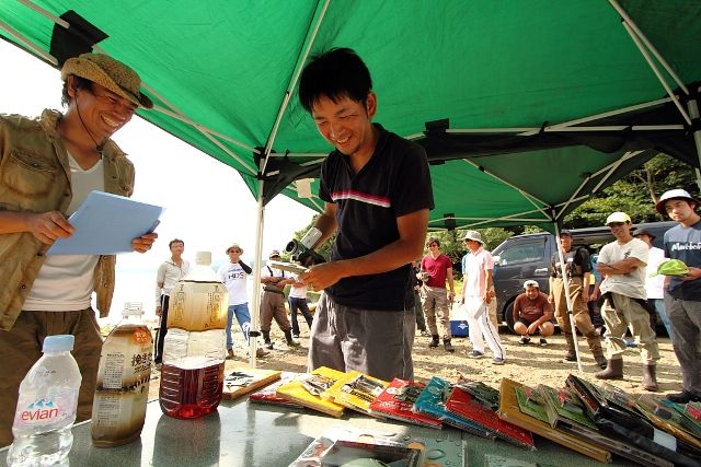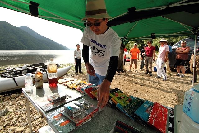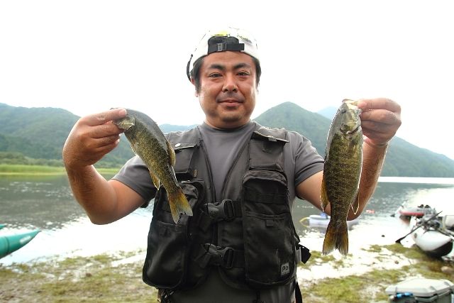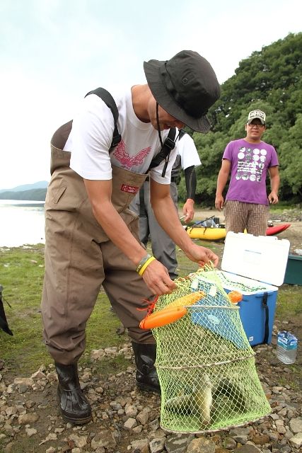 土浦エリア北岸のシャローが張り出した浚渫の1~4mに落ちるブレイクに1日ステイし、回遊バスを狙ってダウンショットよる食わせとキャロによるリアクションの両極端な釣りを使い分けて見事キロアップを含むリミットをそろえた。自らの持つ幾つかのピンスポットの中から、その時の湖の状況と強風の中での慣れないフローター、自らの体力なども考慮して1箇所を絞り込み、このタフコンディションの中でナイスフィッシュを含むリミットをそろえてくる技術と作戦はさすがプロと言うほかない。バス釣りやそれを取り巻く環境に対する意識の高さなど、お話を聞いていて感心させられました。来年度も参加していただけるとのことで、今から非常に楽しみです。