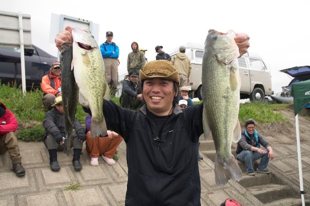 前日プラの際に、自身の春の定番メソッド「シャッドの鬼ジャーク」で800gのナイスフィッシュが獲れたが、大会当日は風もなくベイトのポジションも変わっており同じ釣りでは反応がなかったため、そのパターンは活きていないと判断。一時的に前日とは逆の風が吹いたタイミングを見逃さず、あえてプラで反応が悪かった岬を攻めたところ短時間の間に見事2本をキャッチした。ルアーはパワーダンクで、アクションは水深3.5mをボトムノックさせてのタダ巻き。