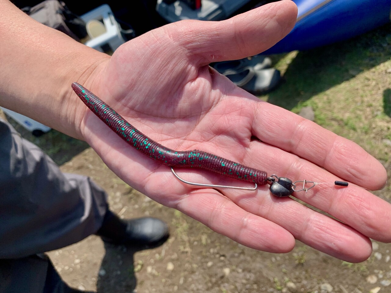 水深のあるエリアの葦撃ちからの中層からボトムをボリュームのあるセンコー5incでリアクションというパターンを前日に見極め何とか1本を絞り出すことに成功しました!