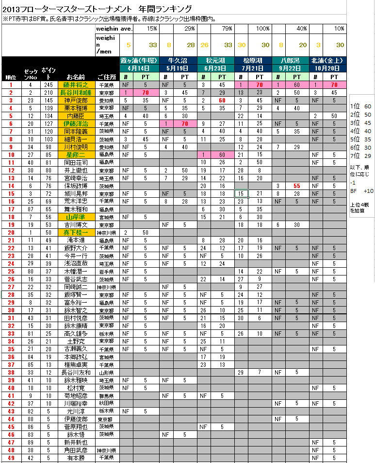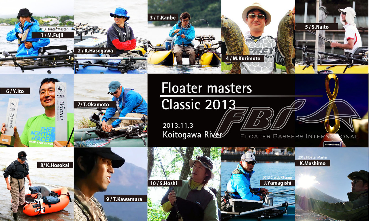 2013年のトーナメントトレイルは最終戦、一騎撃ちを制した藤井氏が通算2度目のフローターマスター獲得。そして年に一度、今年活躍した選手のみが招待される栄誉ある大会、フローターマスターズクラシックが11/3(日)、2013フローターマスターの藤井氏の指定により開催されます。