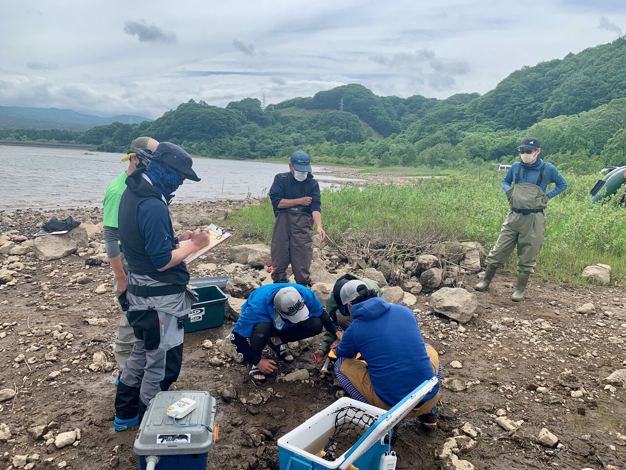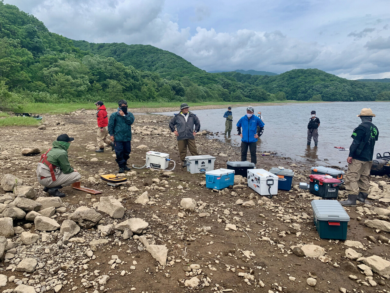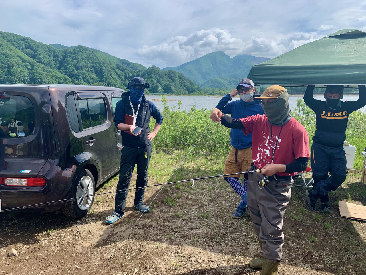 ミーティングでは、ソーシャルディスタンス、マスク着用で、天候や禁止エリア、一般アングラーとの距離感やその他留意事項など参加選手の安全確保とマナー等についての注意喚起が徹底されます。