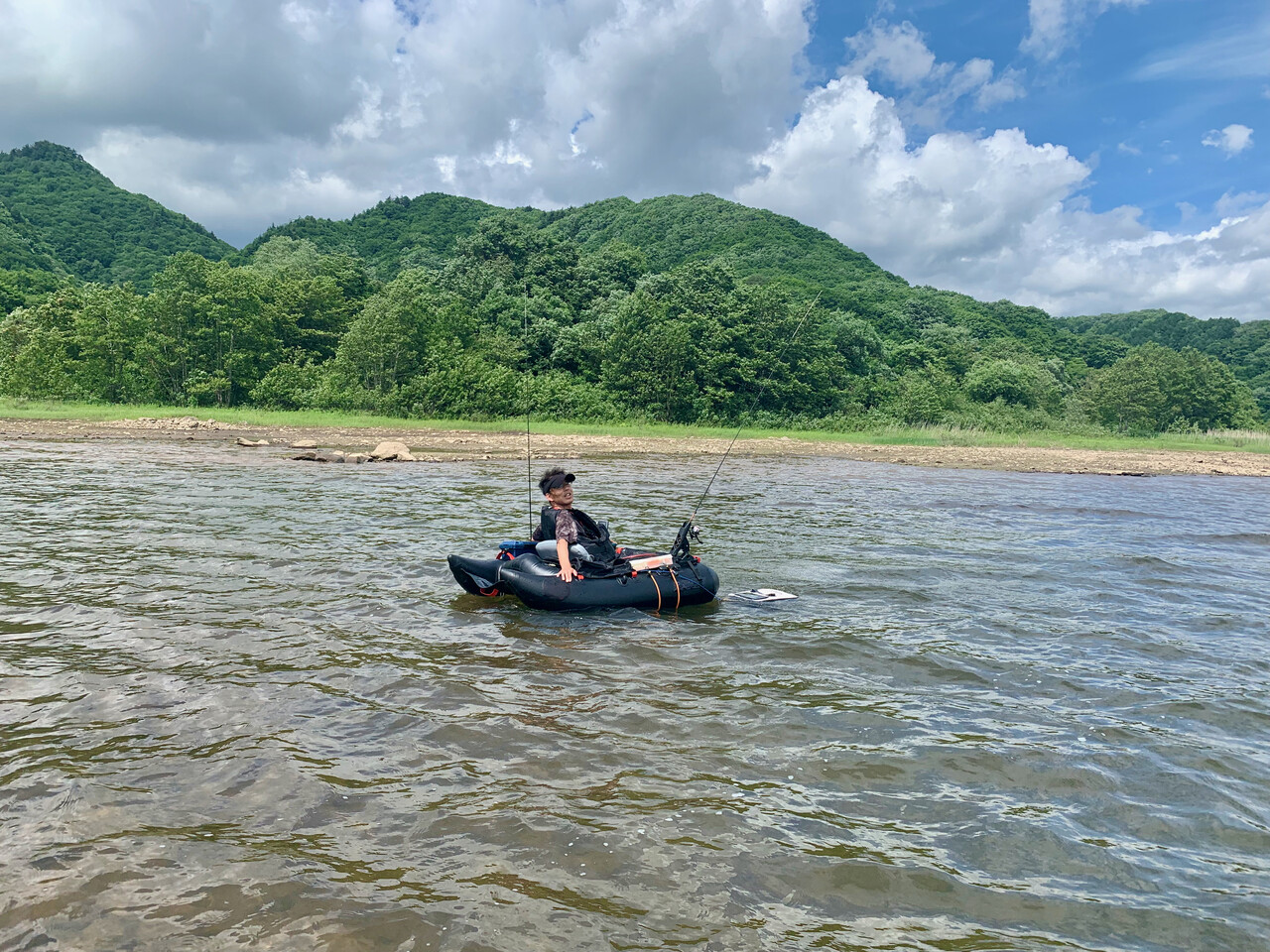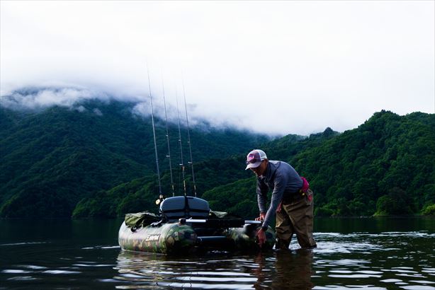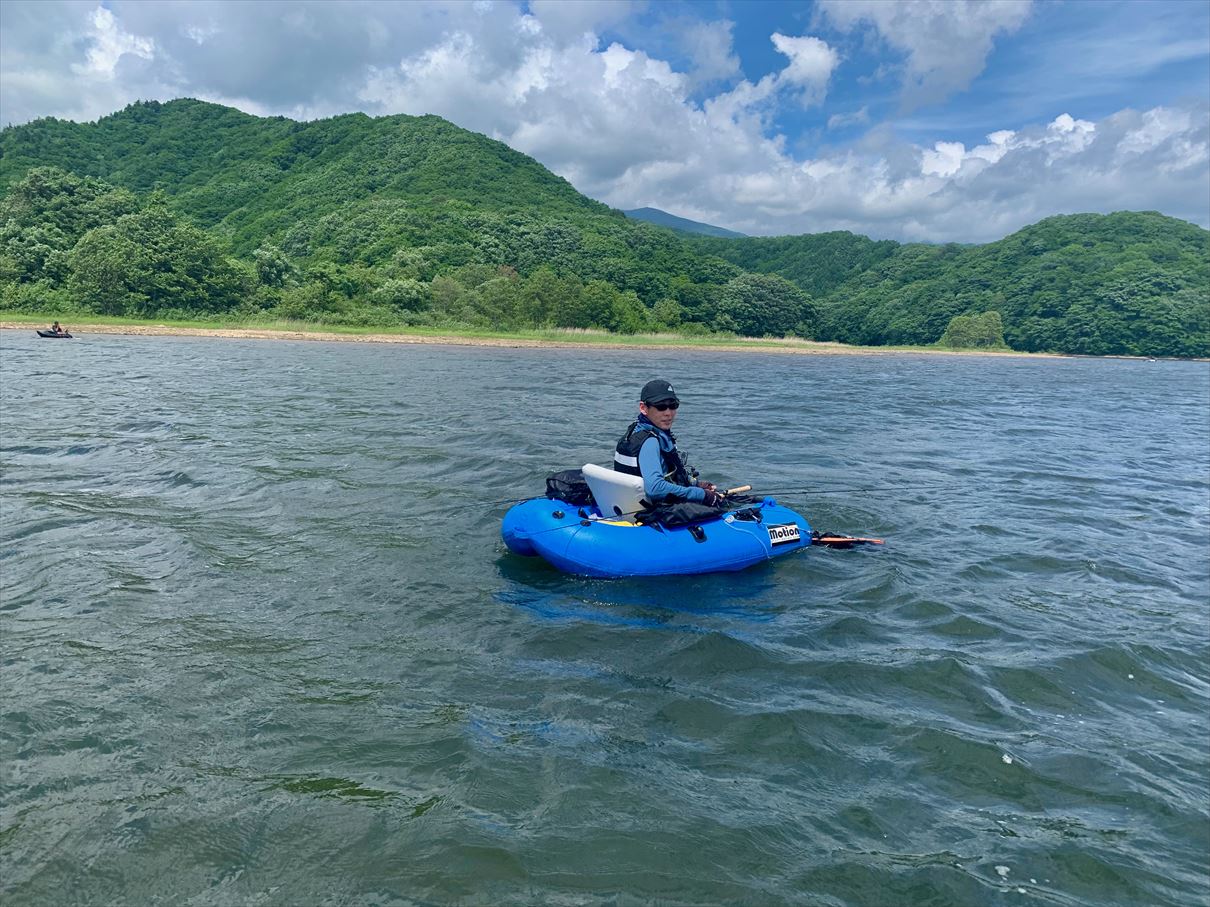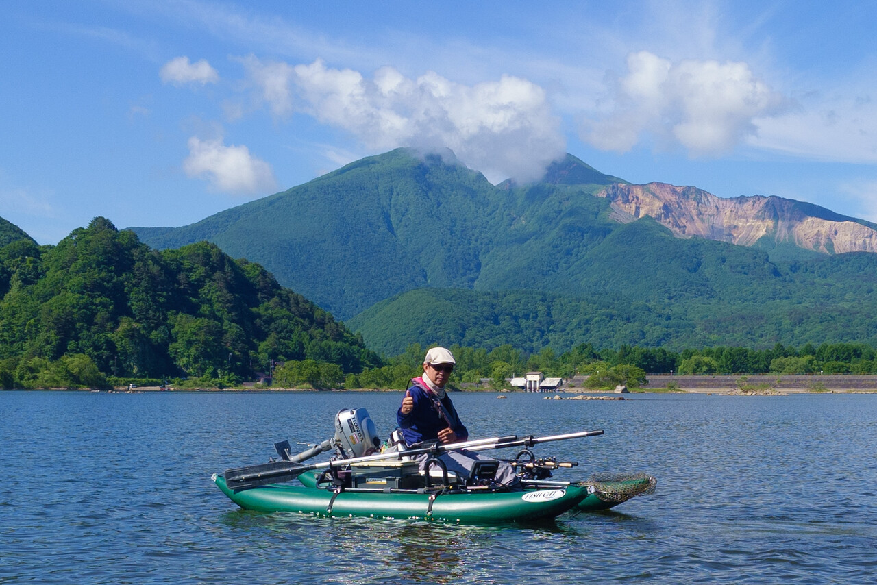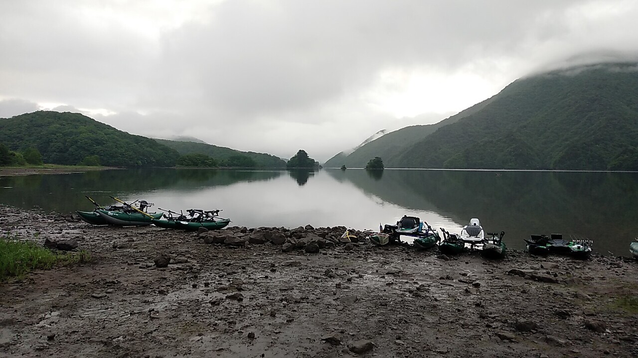 湖の状況は、ほぼ満水の桧原湖に対し、秋元湖は平時より2m程減水しているようで、スタート地点周辺の沖の島周りの普段は水中にある岩の頭が水面から飛び出している程。