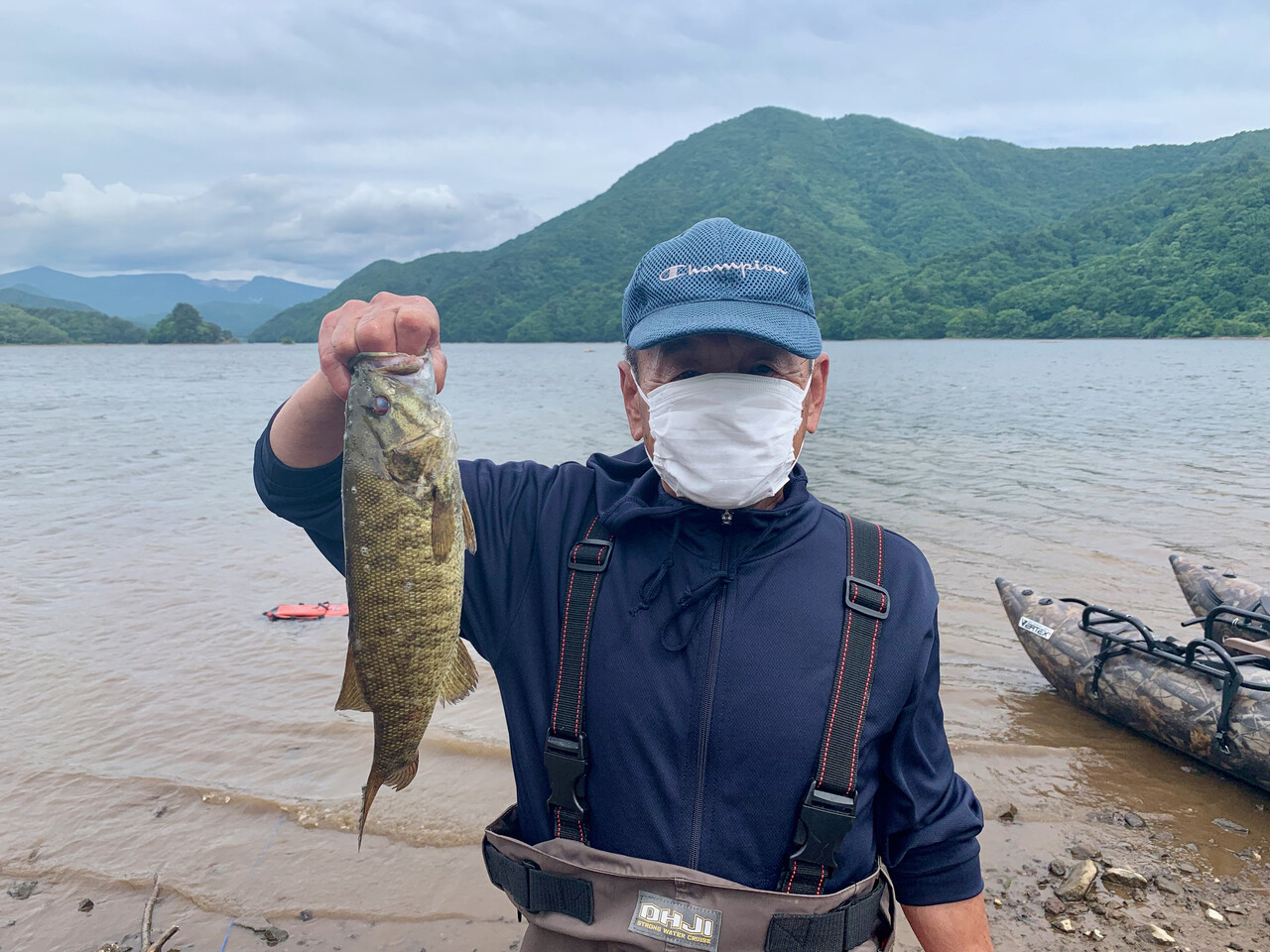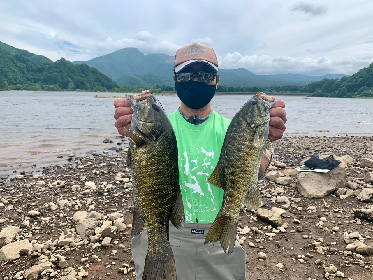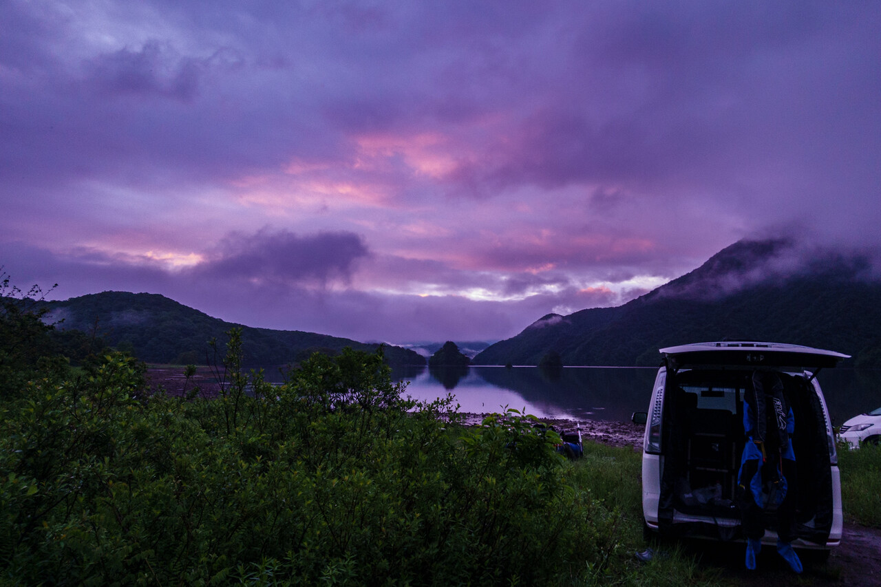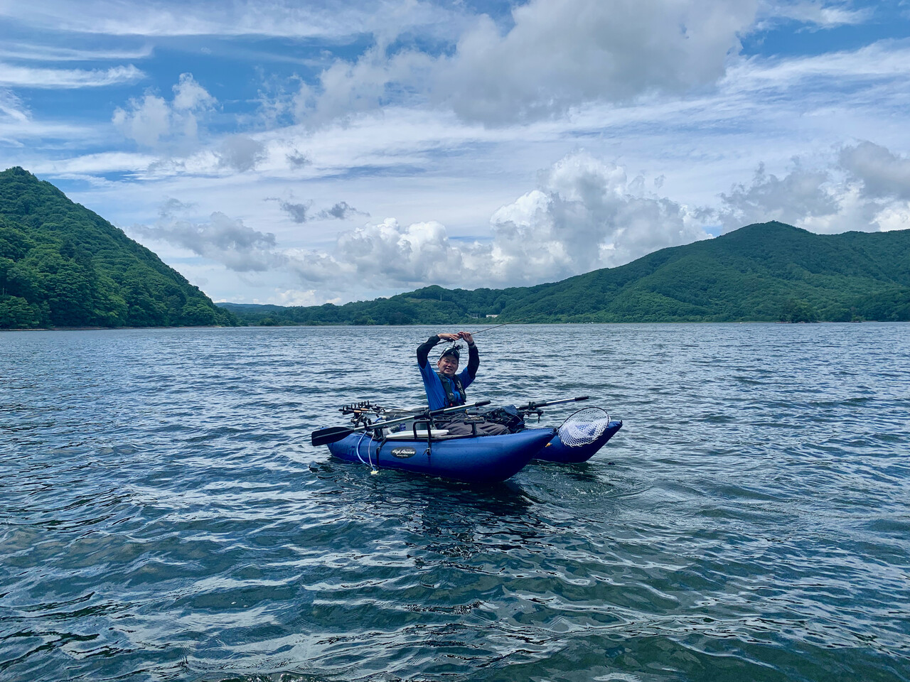 湖の状況は、ほぼ満水の桧原湖に対し、秋元湖は平時より2m程減水しているようで、スタート地点周辺の沖の島周りの普段は水中にある岩の頭が水面から飛び出している程。